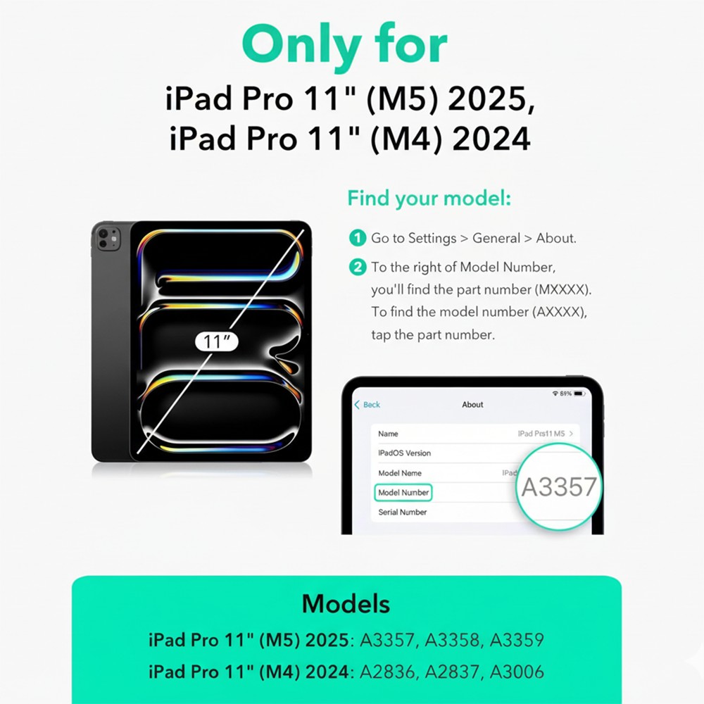 Compatibility: for iPad Pro 11 inch (M5) 2025(Model number: A3357,A3358,A3359; for iPad Pro 11 inch (M4) 2024(Model number: A2836,A2837,A3006; Not compatible with any other iPad models