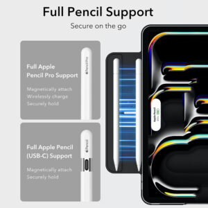 Supports Pencil Pro and Pencil(USB-C): this iPad Pro case fully supports Pencil Pro and Pencil(USB-C) with a recessed side groove for magnetic charging and a magnetic clasp to keep your Pencil secure